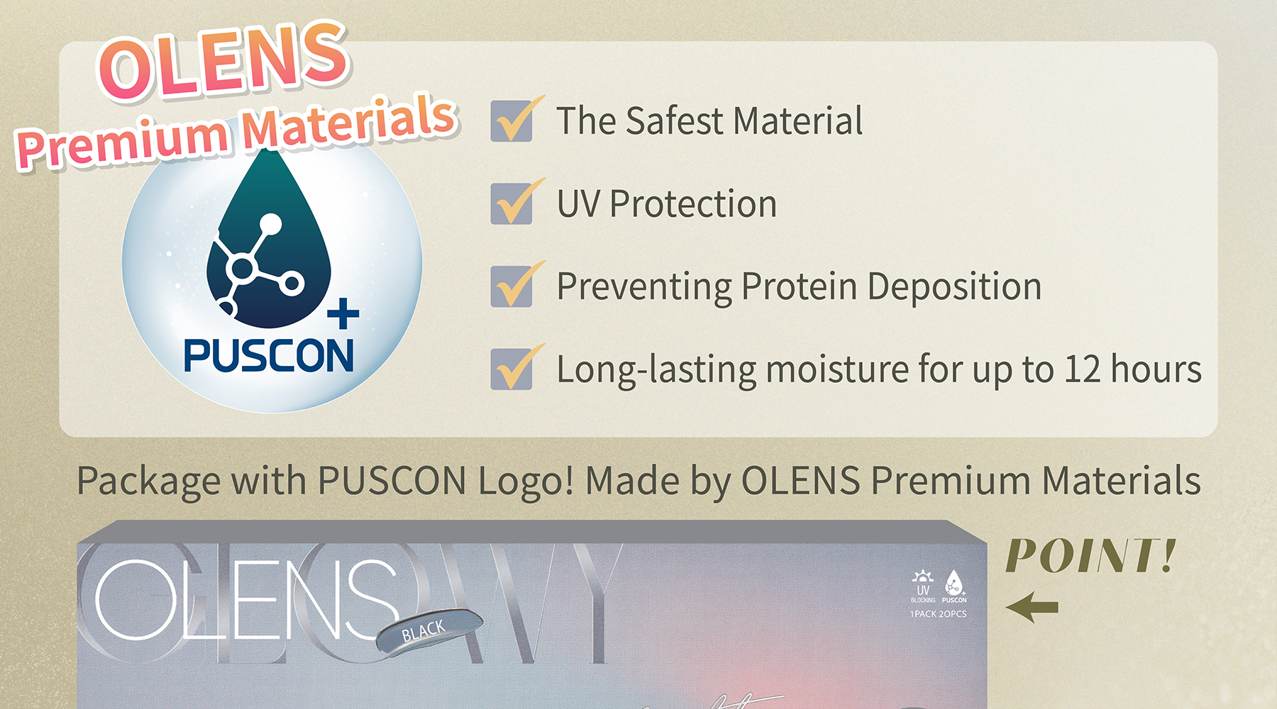 Most OLENS Day Cons are made with the exclusive material PUSCON, certified by the US FDA, providing up to 12 hours of moisture and reducing particle attachment to the lenses. This ensures a clear vision for an extended period while also providing UV protection to shield your eyes from UVA and UVB damage, maintaining the health of your eyes.![]()