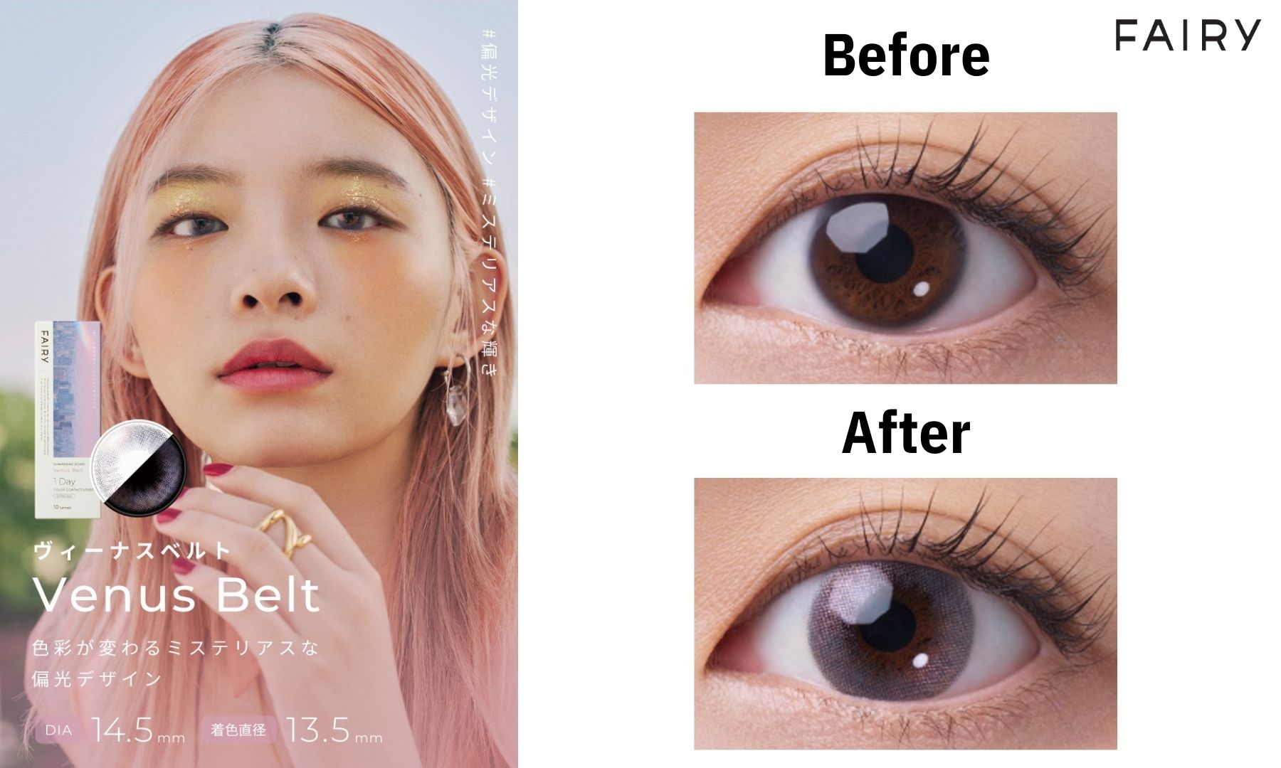 Three-color design enhances the eye contour with high color intensity, creating a mixed-race big-eye effect with a 13.5mm G.DIA.